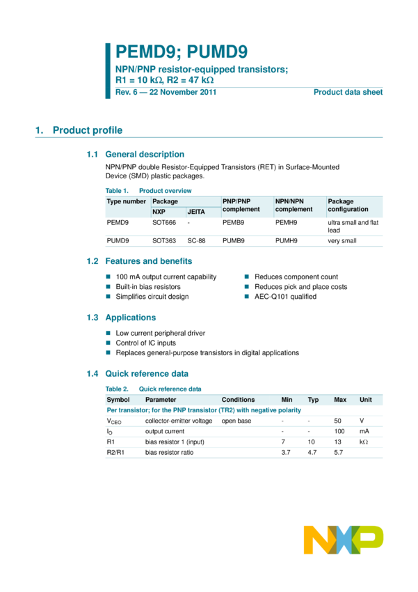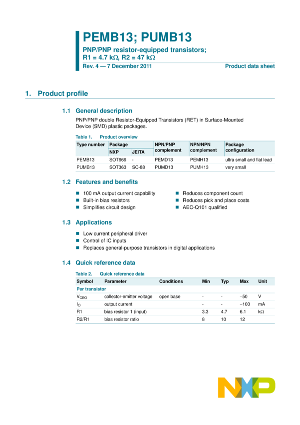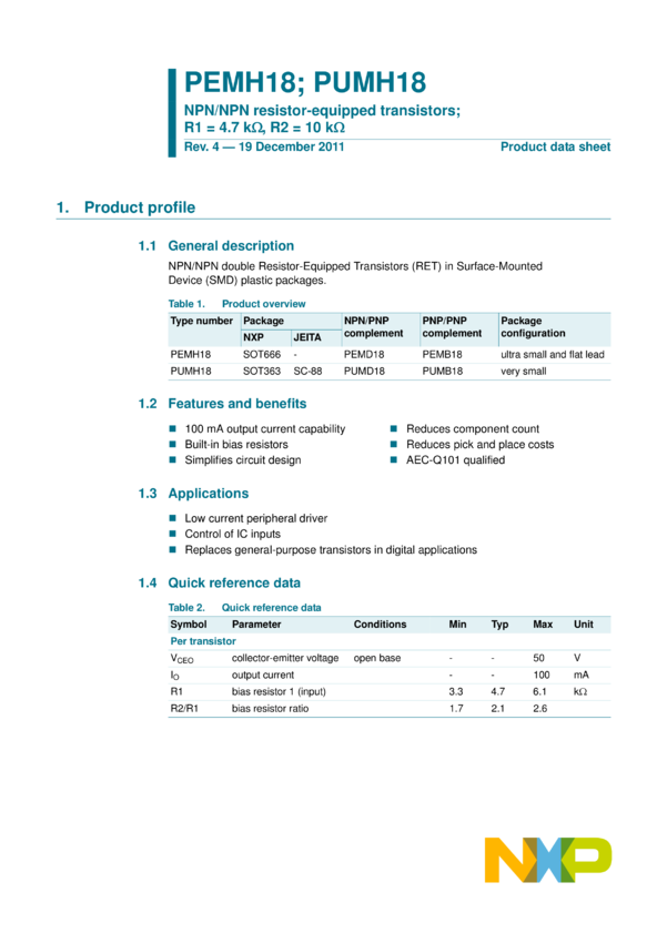 NPN/PNP resistor-equipped transistors; R1 = 10 kOhm, R2 = 47 kOhm