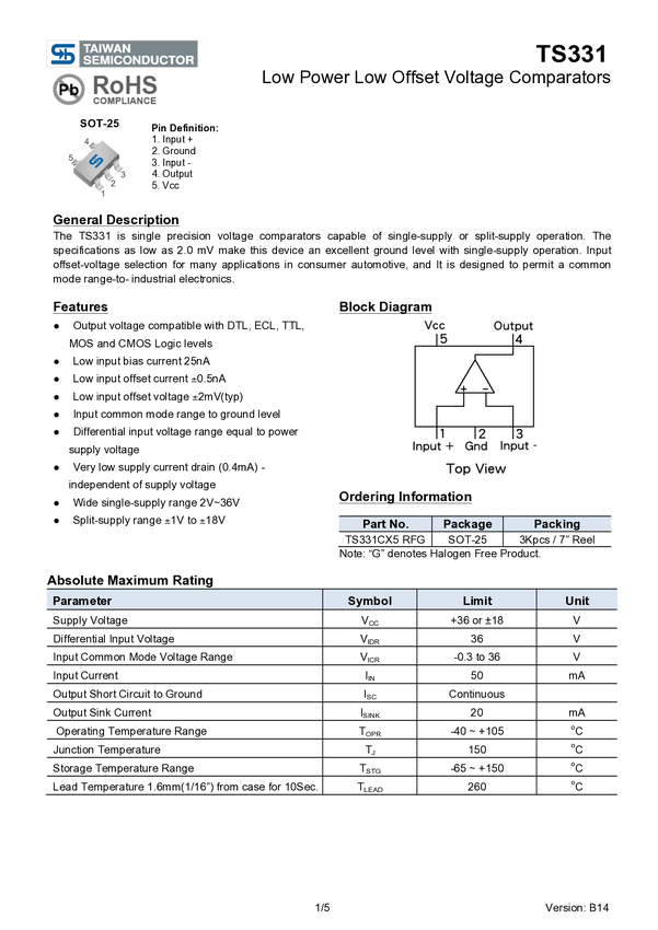 Układ scalony liniowy - komparator Taiwan Semiconductor TS331CX5 RFG SOT-23-5 taśma na dużej rolce