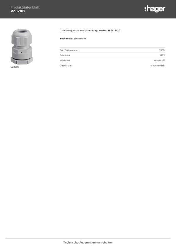 Hager VZ020D Połączenie śrubowe z kompensacją ciśnienia, M20, 1 szt.