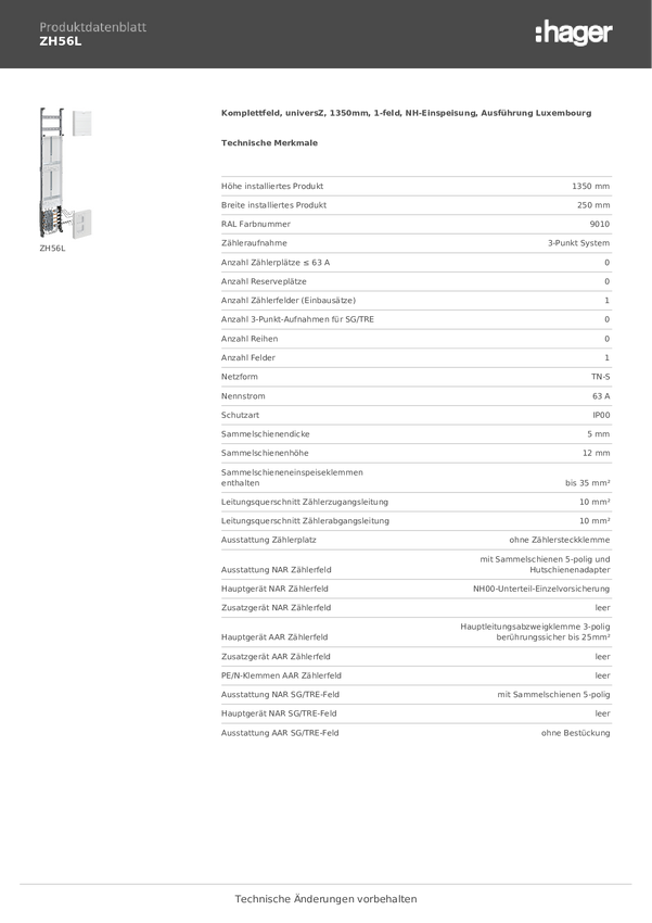 Kompletne pole Hager ZH56L, 250 mm x 1350 mm , 1 szt.