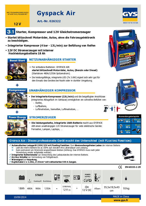 GYS Urządzenie rozruchowe Gyspack Air 3in1 026322 Natężenie rozruchowe przy 12 V=480 A transformator 230 V, kompresor, z