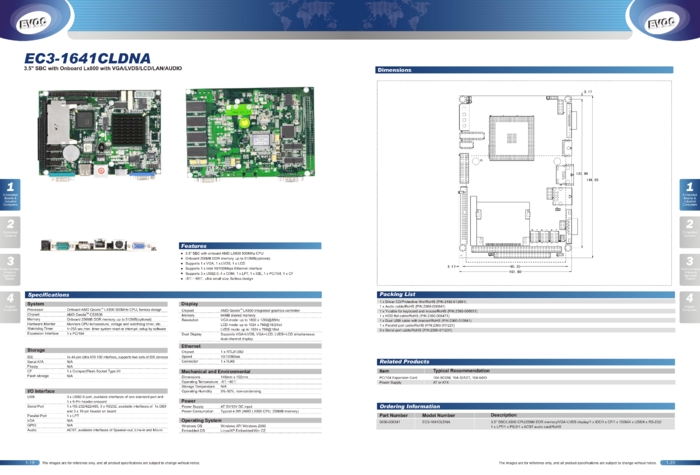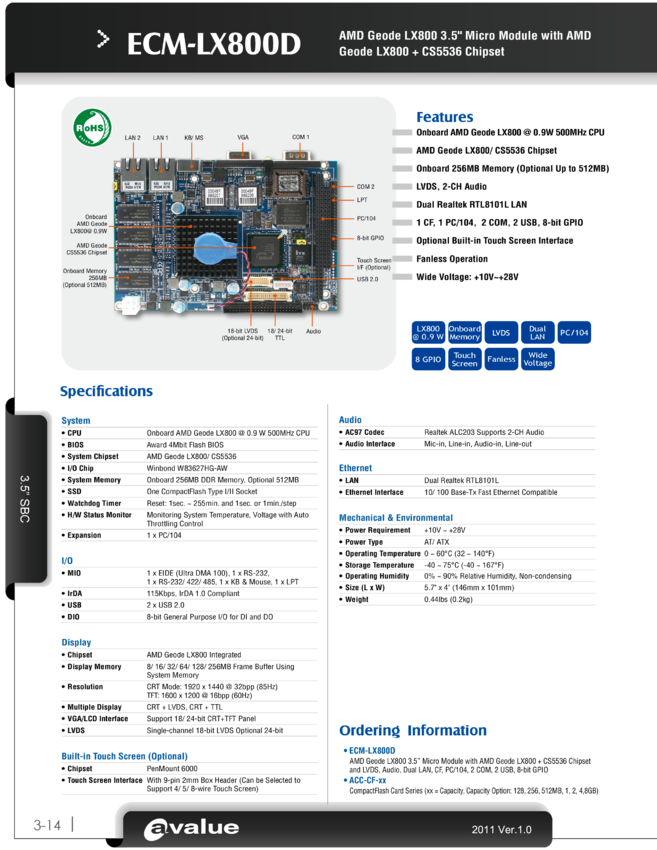 Komputer jednopłytkowy 3.5" ECM-LX800D Geode LX800 @ 0.9 W 500 MHz CPU z wbudowaną pamięcią 256MB RAM, karta CF 1GB, WIN CE 6.0 PRO,