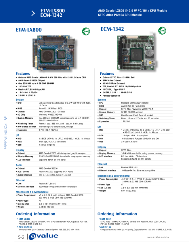 Komputer jednopłytkowy PC/104 ETM-LX800 AMD Geode LX800 @ 0.9 W PC/104+ CPU Module,