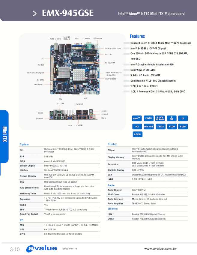 Komputerowa płyta główna EMX-945GSE Intel 945GSE Atom N270 Mini ITX Motherboard, Dual View, 2-CH LVDS,5.1-CH HD Audio, 6W AMP, 1 PCI 2.3, 1 Mini PCIex1, 1 CF, 4 powered COM, 2 SATA, 6 USB, 8-bit GPIO, DVI,