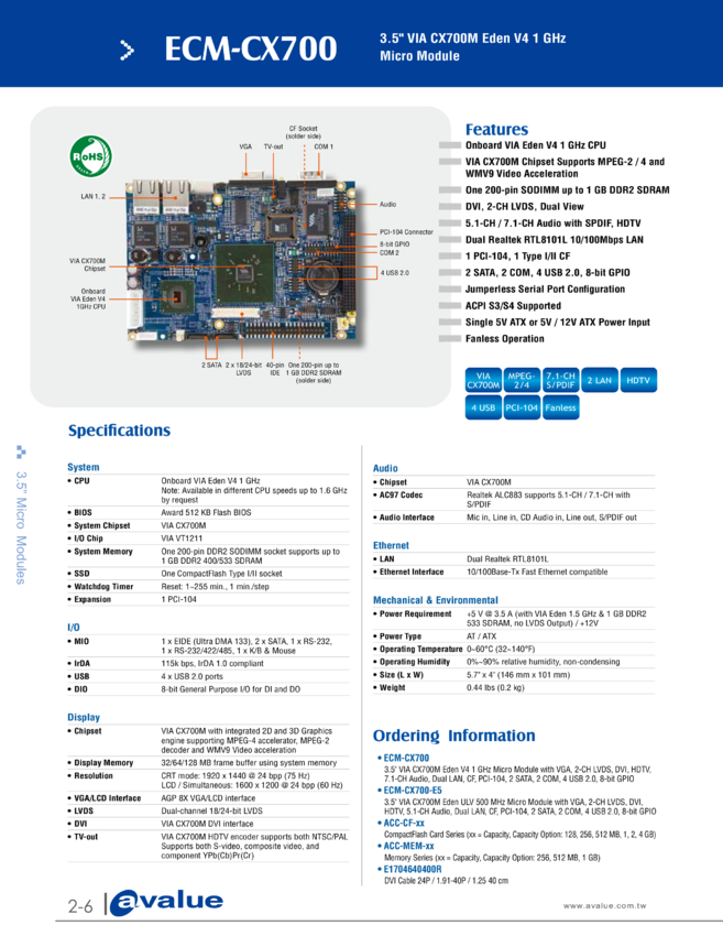 Komputer jednopłytkowy 3.5" ECM-CX700 3.5″ VIA CX700M Eden V4 1 GHz Micro Module,