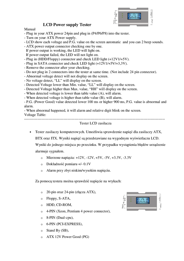 Tester zasilaczy komputerowych (ATX/BTX/ITX) z wyświetlaczem LCD