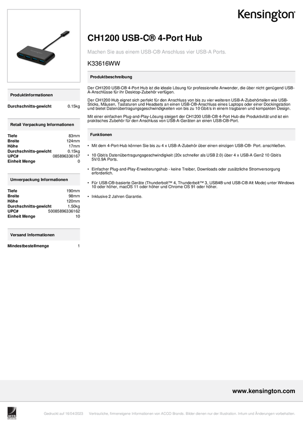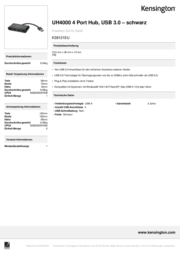 4-portowy koncentrator Kensington UH4000, USB 3.0 — czarny