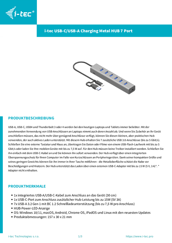 i-tec Metalowy koncentrator ładujący USB-C/USB-A z 7 portami