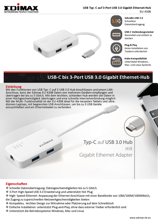 Edimax USB-C do 3-portowego koncentratora USB 3.0 Gigabit Ethernet