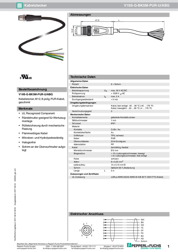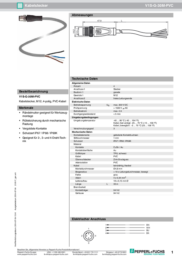 Pepperl+Fuchs 210117 Złącze konfekcjonowane czujnika/aktuatora V1S-G-30M-PVC, piny: 4, 30.00 m, 1 szt.