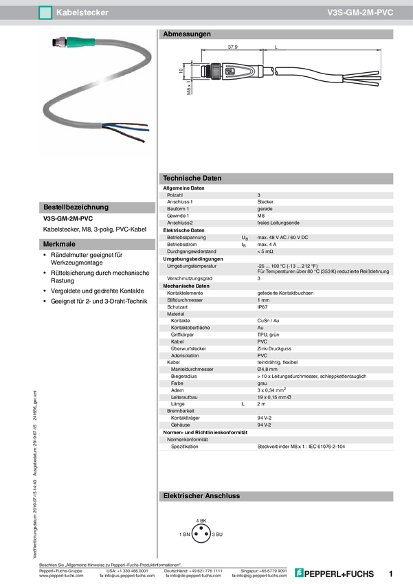 Pepperl+Fuchs 241656 Złącze konfekcjonowane czujnika/aktuatora V3S-GM-2M-PVC, piny: 3, 2.00 m, 1 szt.