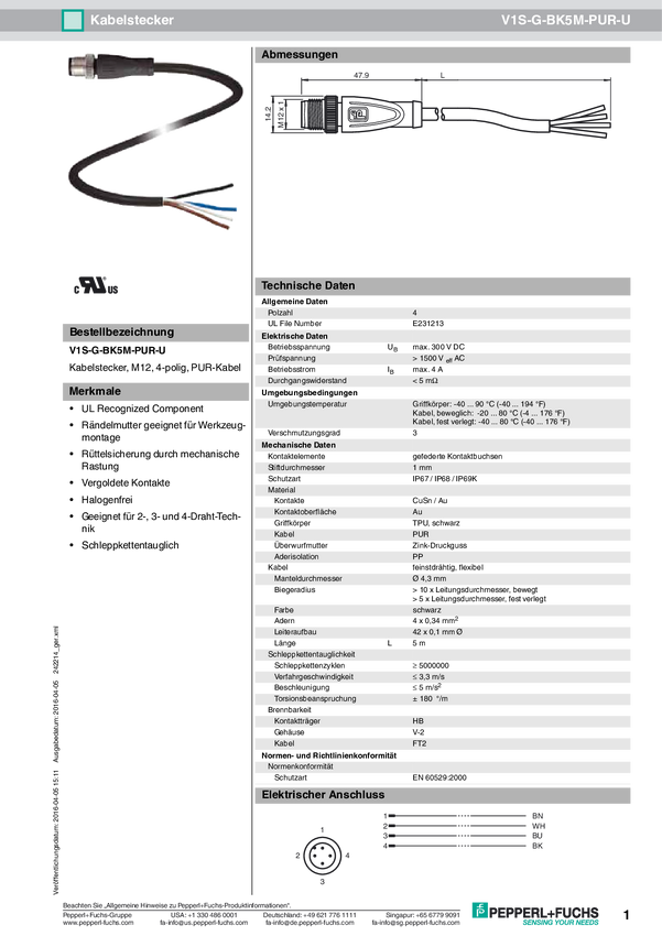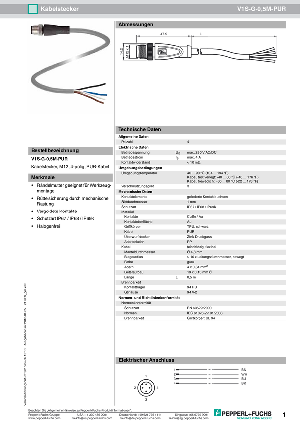 Pepperl+Fuchs 220757 Złącze konfekcjonowane czujnika/aktuatora V1S-G-1,5M-PUR, piny: 4, 1.50 m, 1 szt.