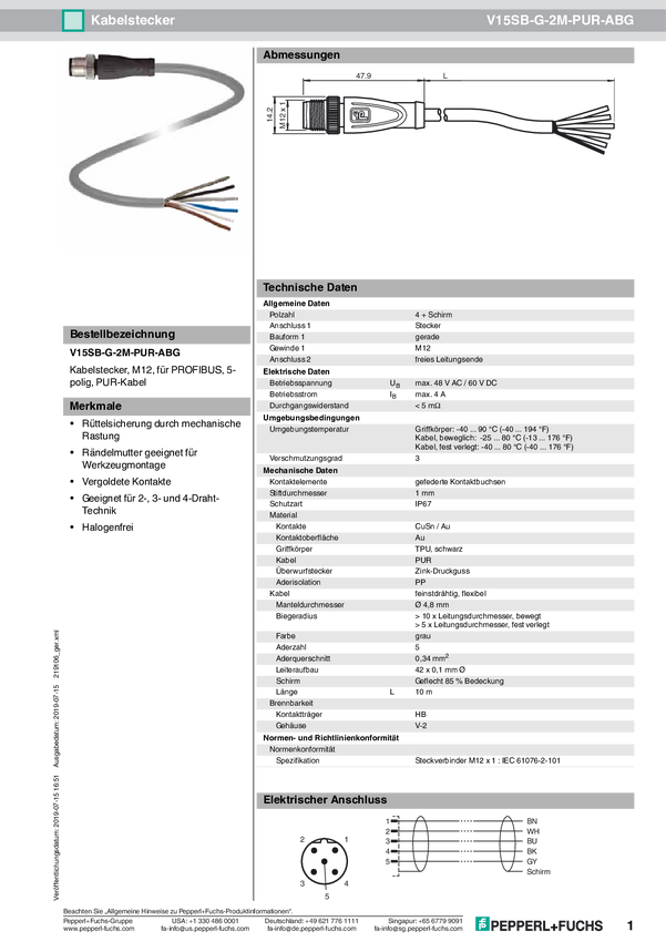 Pepperl+Fuchs 219106 Złącze konfekcjonowane czujnika/aktuatora V15SB-G-2M-PUR-ABG, piny: 4, 10.00 m, 1 szt.