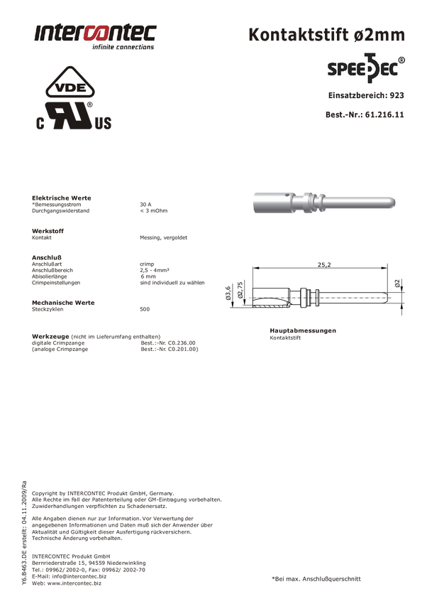 Kołek kontaktowy Intercontec 61.252.11, 1 szt.