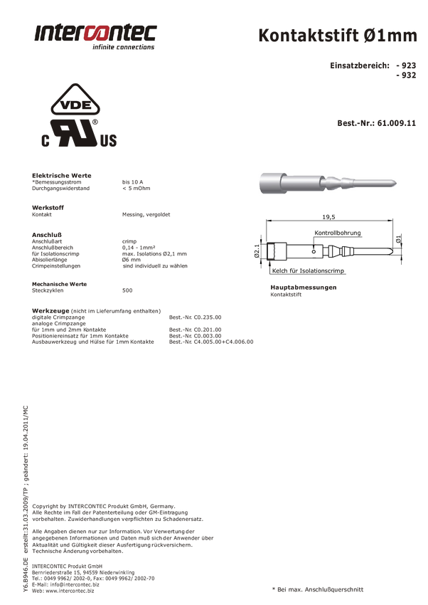 Intercontec 61.009.11 Kołek kontaktowy 1 szt.