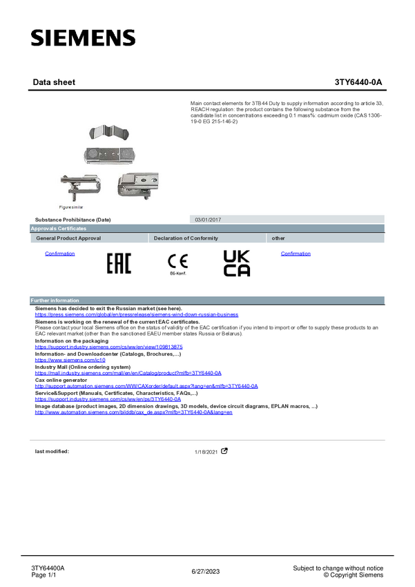 Siemens 3TY64400A 3TY6440-0A Główny element kontaktowy 1 szt.