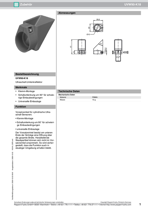 Pepperl+Fuchs 112243 Odbłyśnik reflektora ultradźwiękowego UVW90-K18 1 szt.