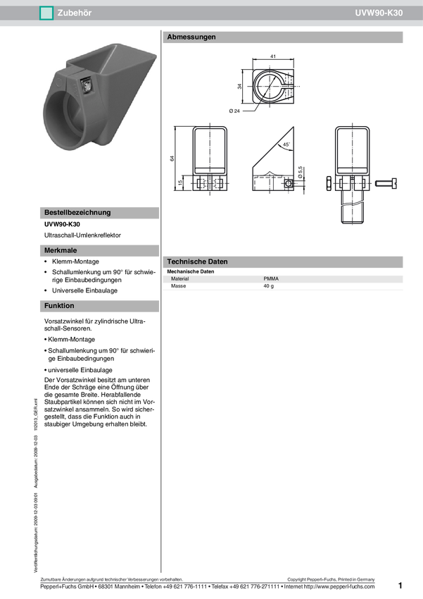 Pepperl+Fuchs 112013 Odbłyśnik reflektora ultradźwiękowego UVW90-K30 1 szt.