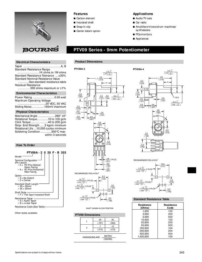 POTENCJOMETR OBROTOWY 9 MM Modele podobne: PMEVU... PMRK09.. Uwaga: katalogowo wymiar F-sugerujący długość ośki faktyczni e jest wymiarem całkowitym ośka + korpus