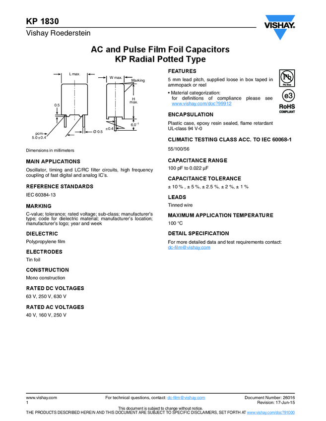 AC and Pulse Film Foil Capacitors KP Radial Potted Type