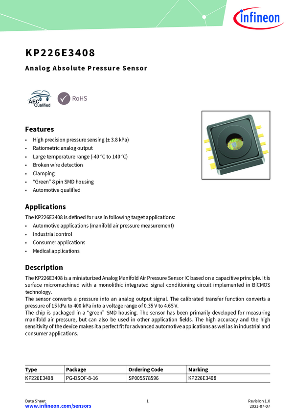 XENSIV™ - KP226E3408 analog Turbo MAP sensor with improved accuracy pressure sensing The Infineon KP226E3408 expands the broad family of Turbo MAP sensors, boasting improved accuracy in pressure sensing. This automotive-qualified MAP sensor with 3.8 kPa accuracy is ideal for automotive applications like ECU, while also suitable for industrial and consumer uses due to its high accuracy, sensitivity, and safety features.