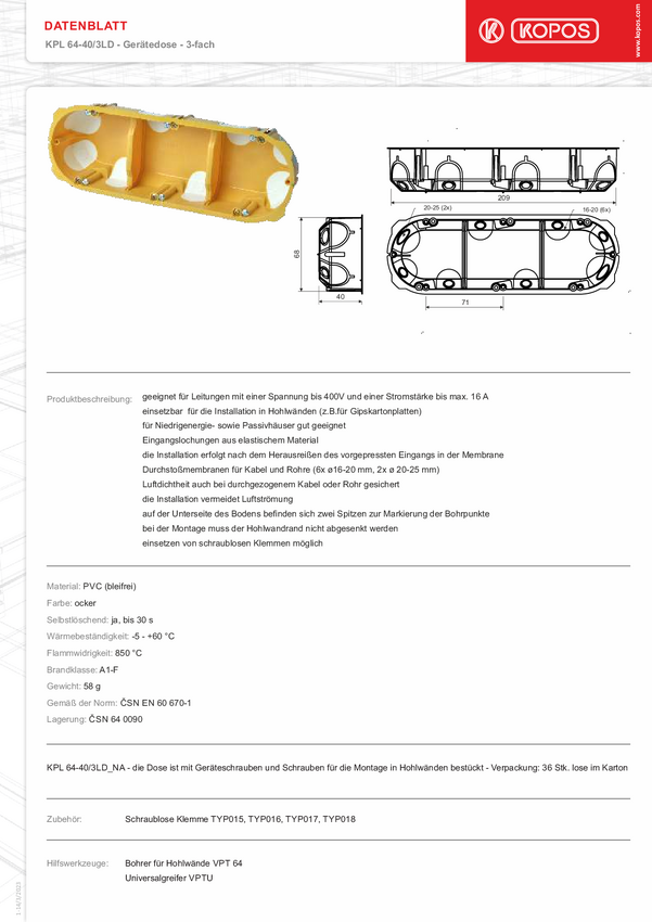 Gniazdo do ściany szczelinowej KOPOS Hohlwanddose KPL 64-40/3LD_NA, 209 mm x 68 mm x 40 mm, 1 szt.