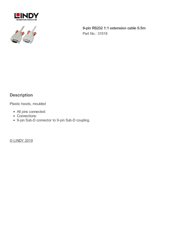 przedłużacz port szeregowy LINDY LINDY RS232 Kabel 9 SubD St/Kpl 0,5m 31518, 0.50 m