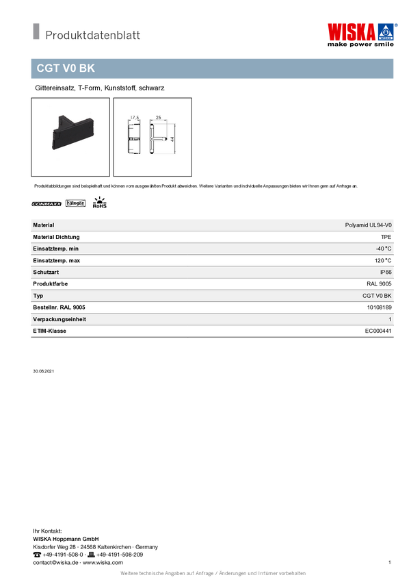 Wiska 10108189 Wkładka kratowa CGT V0 BK, (D x S) 25 mm x 17.5 mm, tworzywo sztuczne, 1 szt.