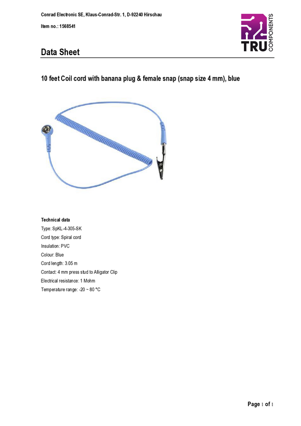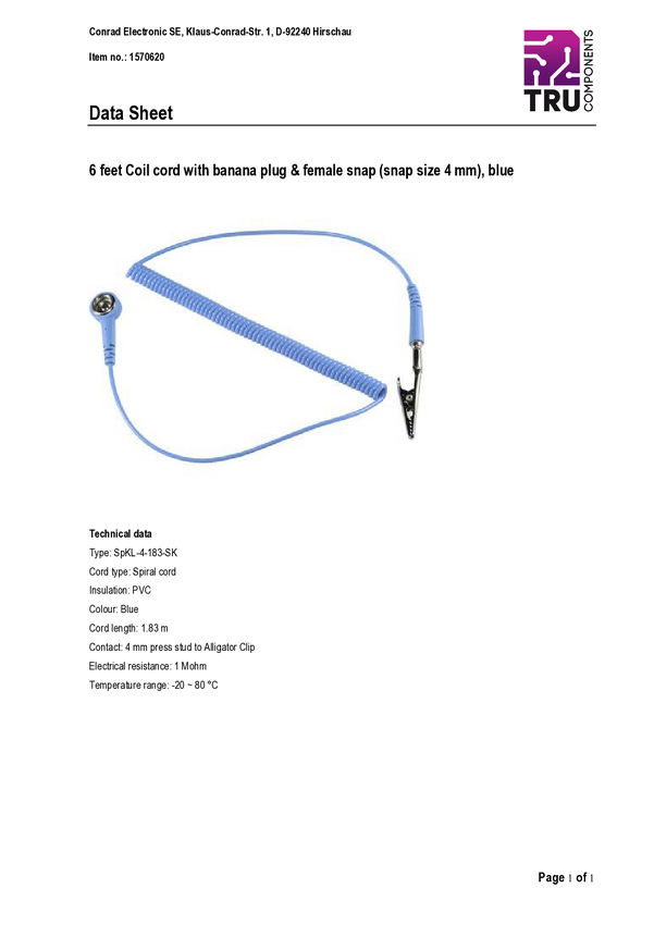 TRU COMPONENTS SpKL-4-183-SK Przewód uziemiający ESD 1.83 m przycisk 4 mm, zacisk krokodylkowy