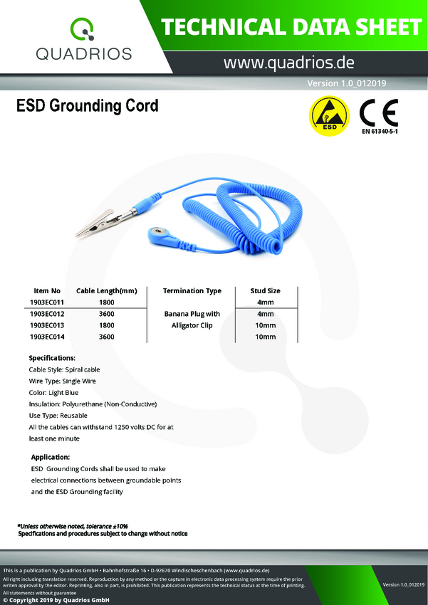 Quadrios Przewód uziemiający ESD 3.00 m klema, przycisk 10 mm , złącze męskie, zacisk krokodylkowy