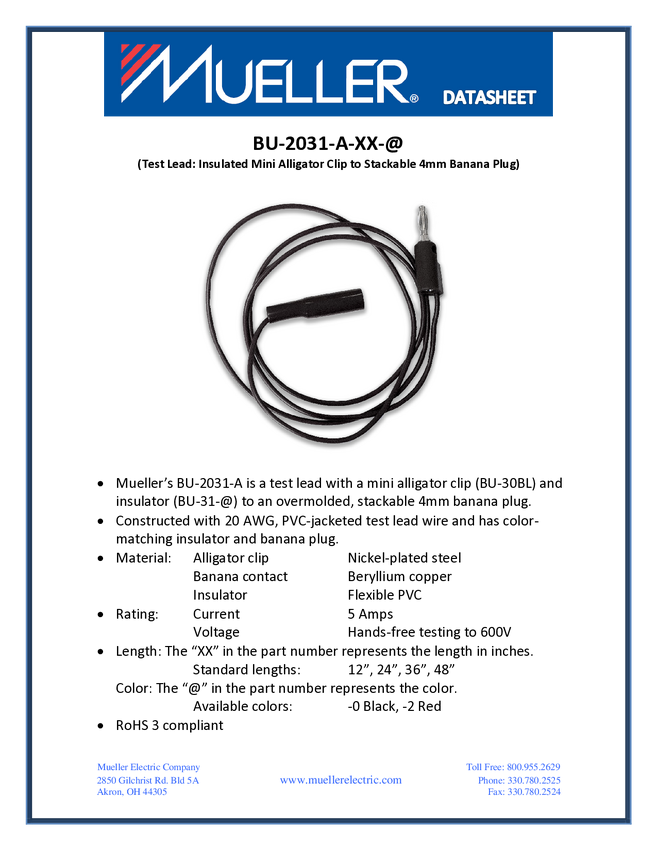 Mueller Electric BU-2031-A-24-0 Przewód pomiarowy złącze męskie bananowe 4 mm Mini klips krokodylkowy 0.6 m czarny 1 szt