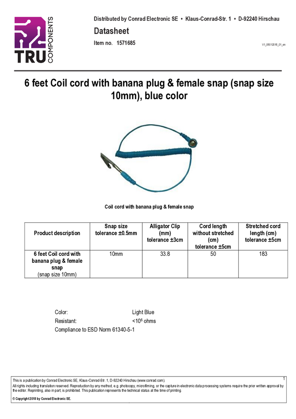 TRU COMPONENTS SpKL-10-183-SK Przewód uziemiający ESD 1.83 m przycisk 10 mm , zacisk krokodylkowy