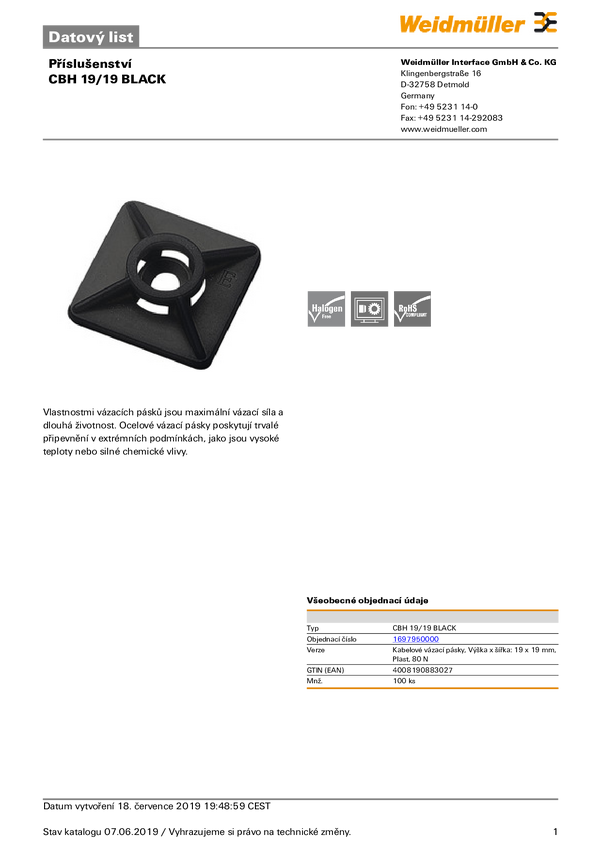 Gniazdo montażowe do opasek kablowych Weidmüller 1697950000 Weidmüller CBH 19/19 BLACK 1697950000 splotka 4-krotna 100 s