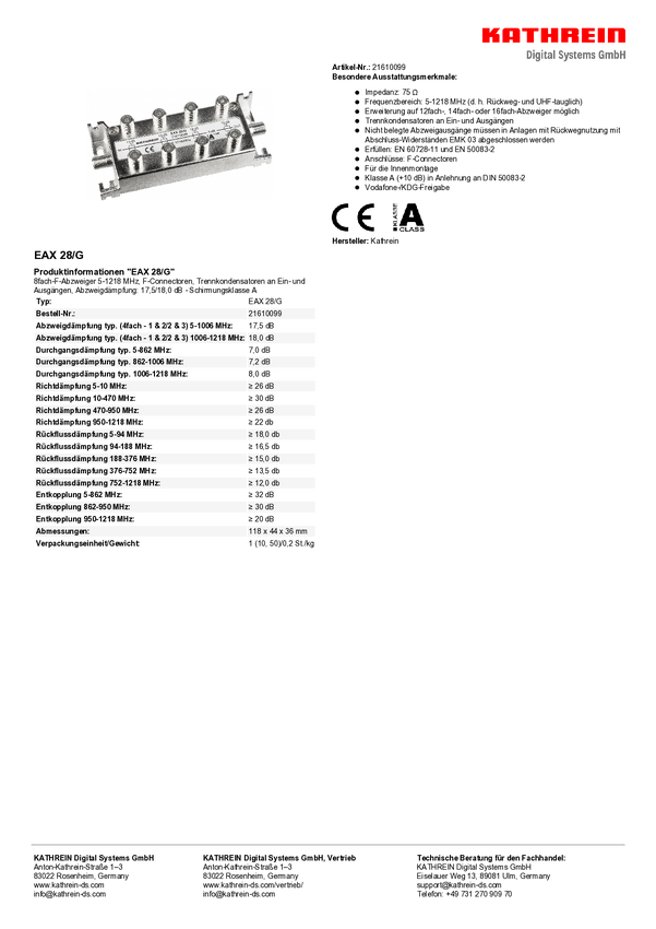 Kathrein EAX 28/G Rozdzielacz sygnału telewizji kablowej 4-krotny 5 - 1218 MHz