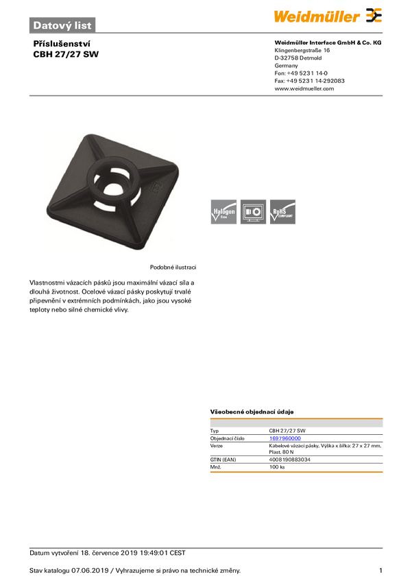 Gniazdo montażowe do opasek kablowych Weidmüller 1697960000 Weidmüller CBH 27/27 SW 1697960000 splotka 4-krotna 100 szt.