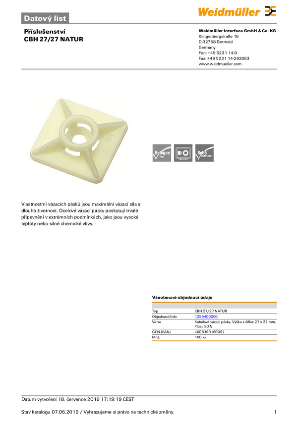 Gniazdo montażowe do opasek kablowych Weidmüller 1289400000 Weidmüller CBH 27/27 NATUR 1289400000 splotka 4-krotna 100 s