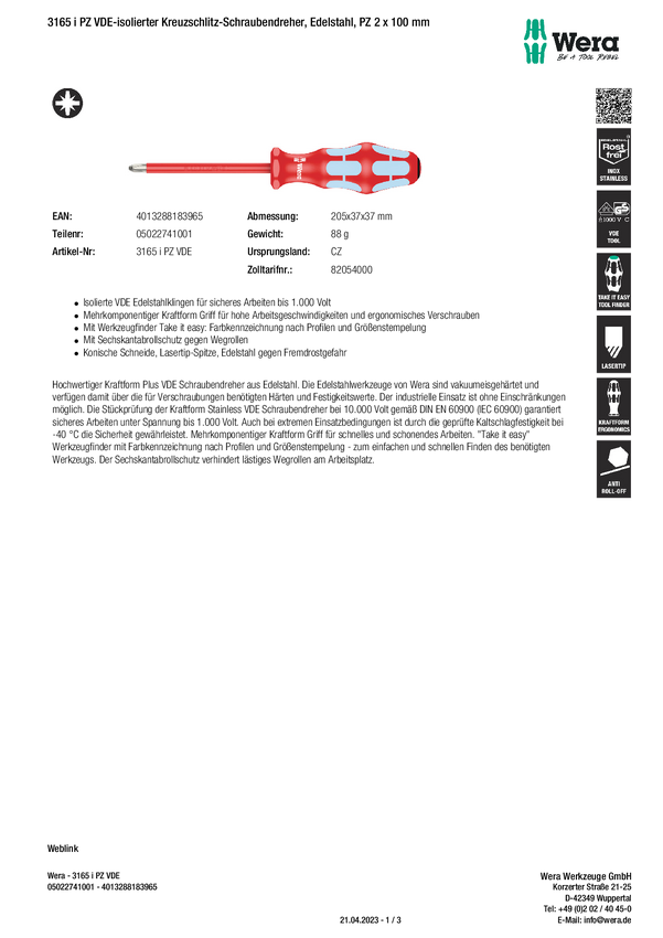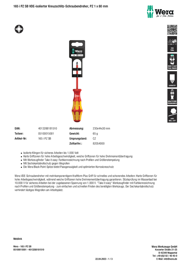 Wkrętak krzyżowy Wera 3165i 05022741001