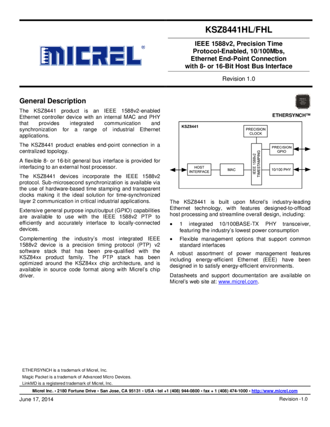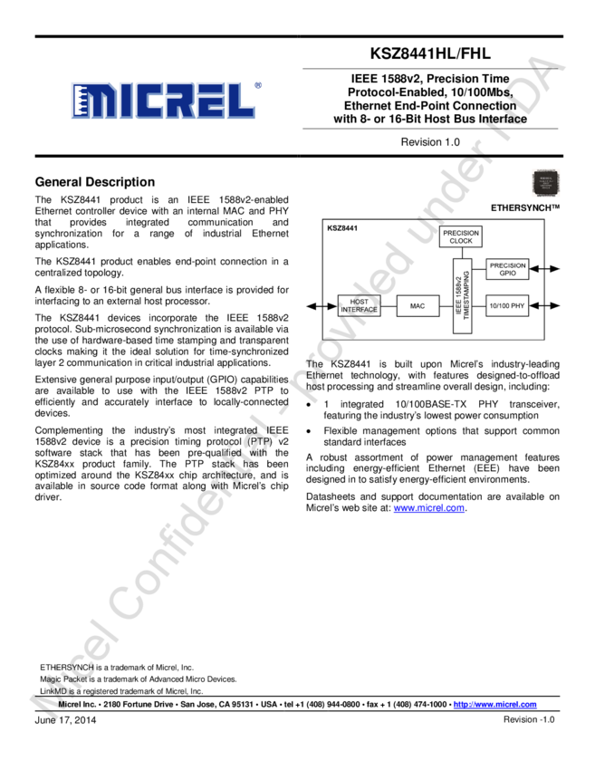 KSZ8441HL FHL Data Sheet 1.0 (Confidential watermark) (09/21/2015)