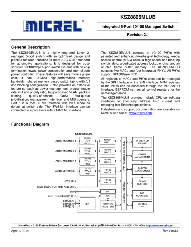 KSZ8895MLUB - Integrated 5-Port 10/100 Managed Switch