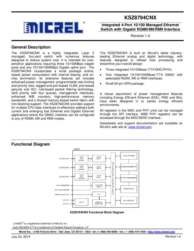 KSZ8794CNX - Integrated 4-Port 10/100 Managed Ethernet Switch (11/09/2015)