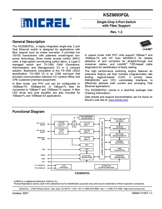 KSZ8893FQL - Single-Chip 3-Port Switch with Fiber Support
