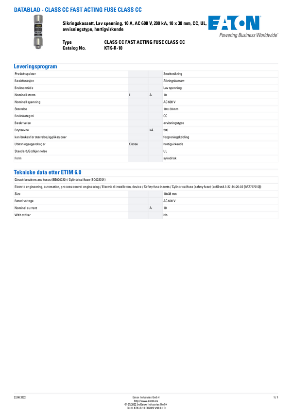 Eaton KTK-R-10 Bezpiecznik użytkowy 1 styk 10 A 600 V 10 szt.