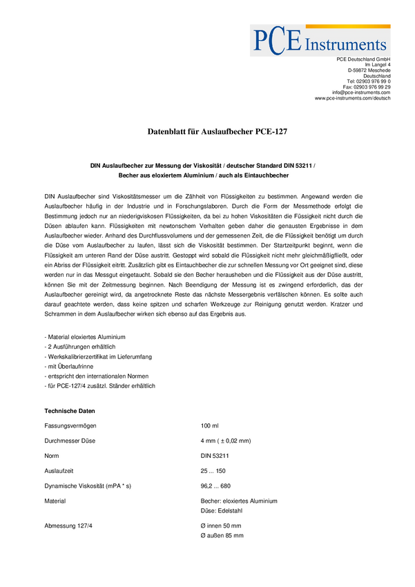 Kubek do pomiaru lepkości PCE Instruments PCE-127/4P 1 szt.