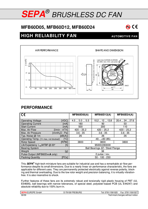 Wentylator 40x40x20; rozstaw śrub 32mm; DC 12V ( 7-13,8V); 0,06A; moc 0,75W; 6300 obr/min; 0,2m3/h ;24 dBA; łóżysko kulkowe; 3 kabelki; trwałość 70000hrs@40 st Locked Rotor Sensor Wentylator Delta