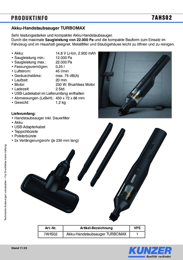 Kunzer TURBOMAX 7AHS02 Odkurzacz ręczny, akumulatorowy 14.8 V z akumulatorem