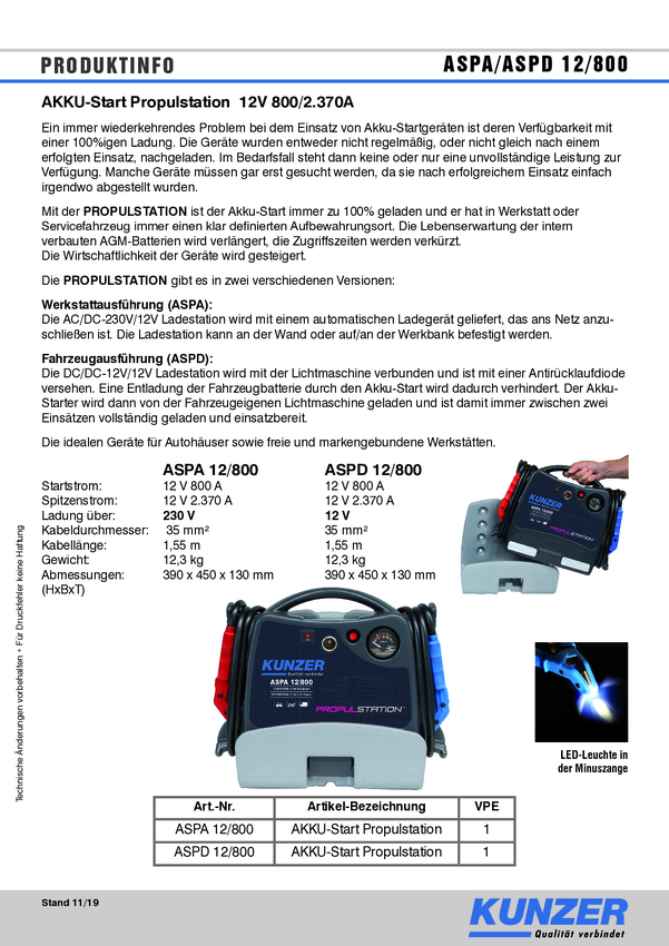 Urządzenie rozruchowe, booster Kunzer ASPA 12/800, Natężenie rozruchowe przy 12 V: 800 A