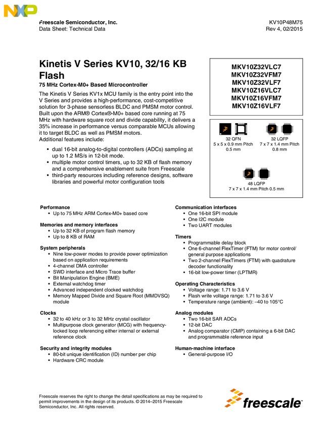 Kinetis KV10: 75MHz Cortex-M0+ Real-time Control MCU, 32KB Flash, 8KB SRAM, 32-LQFP