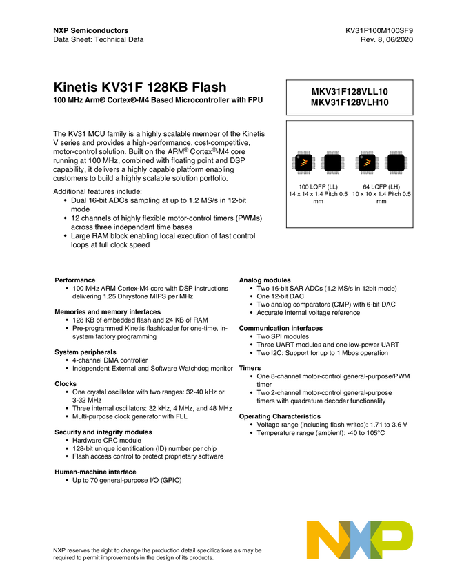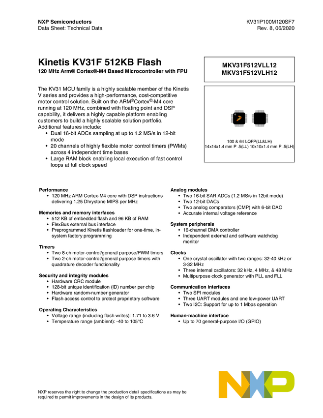 Kinetis KV31: 120MHz Cortex-M4F Real-time Control MCU, 512KB Flash, 96KB SRAM, 64-LQFP
