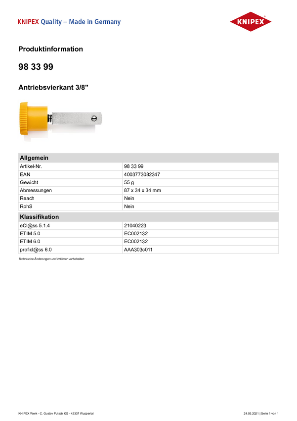 Kwadrat napędowy Knipex Knipex-Werk 98 33 99