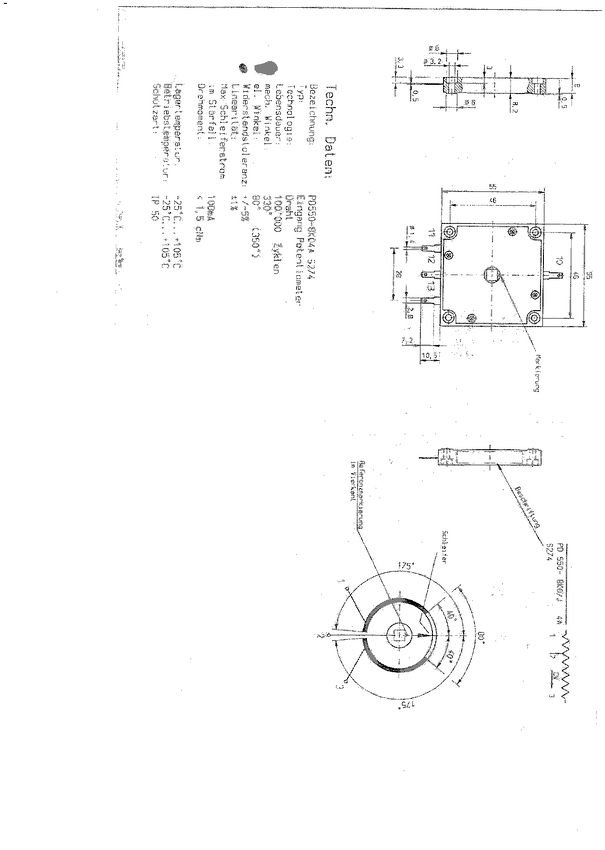 Potencjometr kwadratowy do joysticków z CT Center Tap Rezystancja 8 kohm, 100.000 cykli, drutowy, IP50, Lin +-1%; Kąt pracy mechaniczny 330 stopni, kąt pracy elektryczny 80 stop ( 350 stopni); przy 350 stopni = 135 stopni dead band; 40 stopn 4 kohm 40 stopni / 4 kohm; 135 stopni dead band zakres temperatur pracy to -25+105 stopni moc wersji standard 3W / 5W przy 40 stopniach